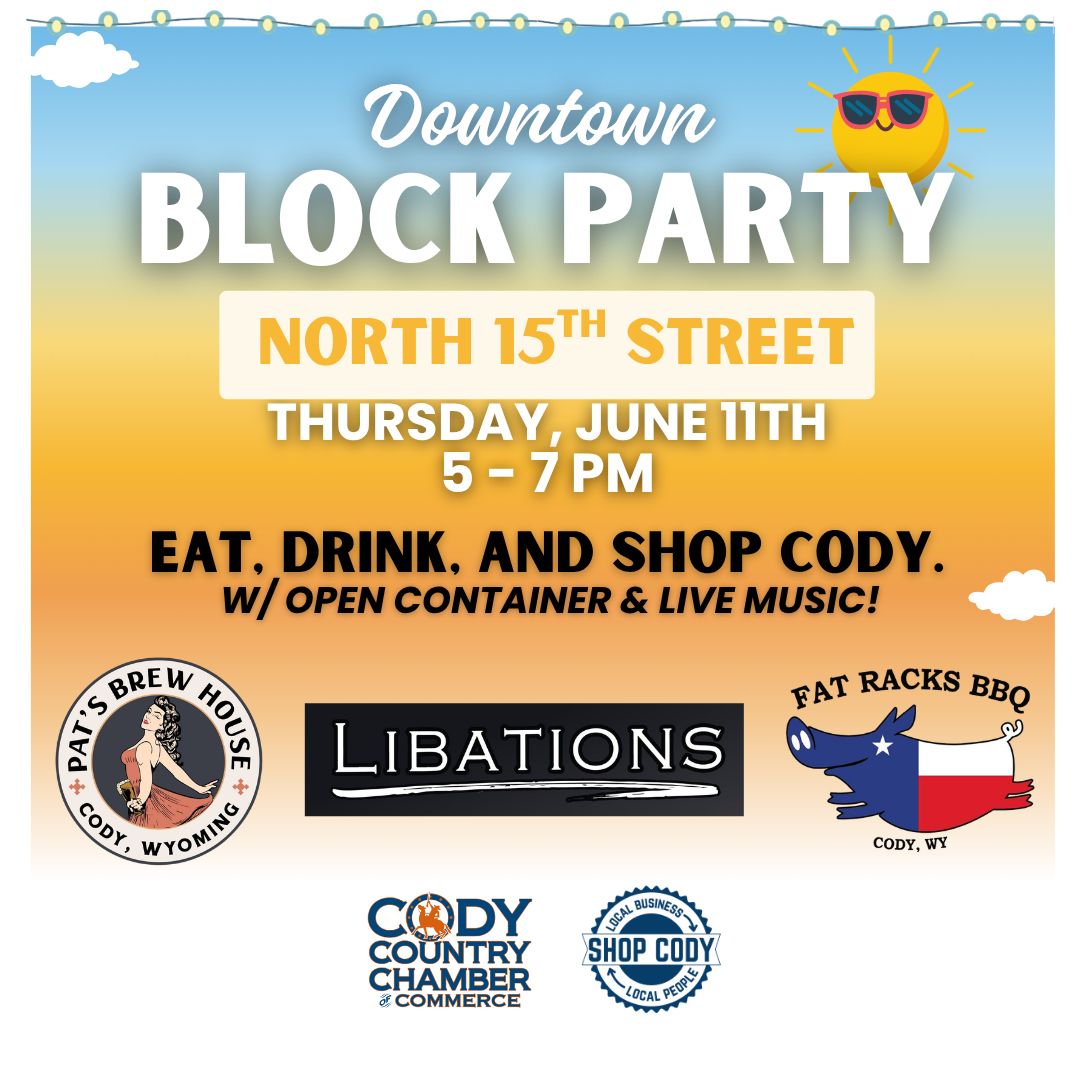 Join us for the Downtown Block Party on North 15th Street, Thursday, June 11th from 5–7 PM. Enjoy an evening of food, drinks, shopping, and live music right in the heart of Cody. With open container in effect, you can grab a drink and explore. Stop by Libations along with Pat’s Brewhouse and Fat Racks BBQ and be part of the fun.